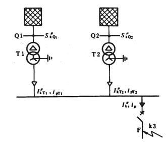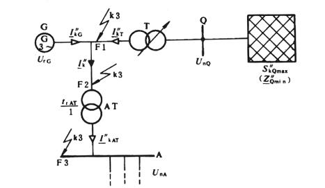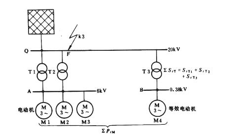若短路点位于图24中的Q点或母线A上,计算中可用变压器T3的额定电流代替等效电动机的额定电流Irm4。