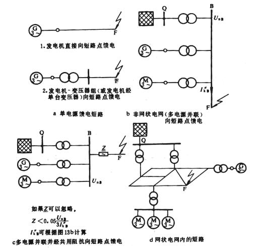 至少有一台同步电机供给短路点的预期对称短路电流初始值超过这台发电机额定电流两倍的短路;或同步和异步电动机反馈到短路点的电流超过不接电动机时该点的对称短路电流初始值I〃K的5%的短路。