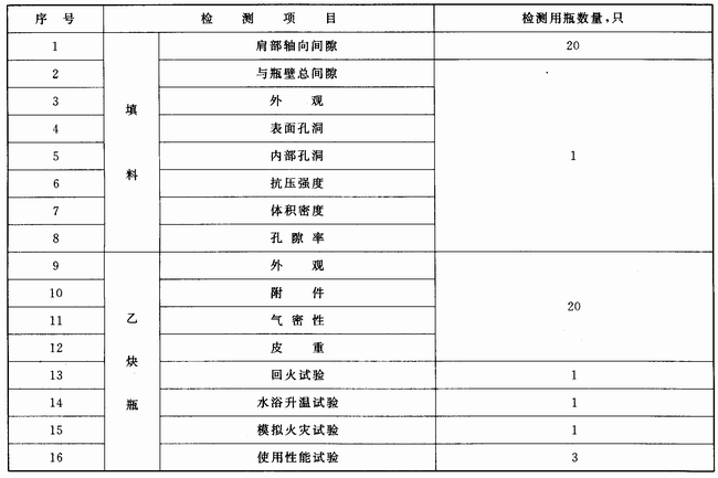 4.乙炔瓶钢瓶质量的检测,按《气瓶安全监察规程》附录3《气瓶技术鉴定的内容和要求》执行。检测用钢瓶从试制的钢瓶中抽取,数量不得少于20只。